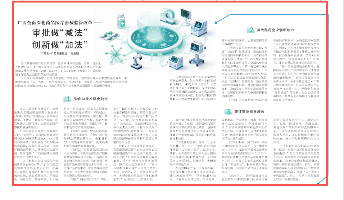 为了破解医药产业创新堵点,提升审评审批效能,近日,自治区人民政府发布《广西全面深化药品医疗器械监管改革促进医药产业高质量发展行动方案(2025—2027年)》(以下简称《方案》),系统绘制了深化药品监管改革的行动蓝图。