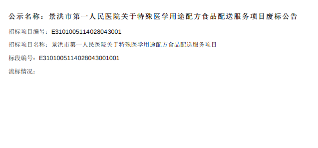 【西双版纳傣族自治州景洪市第一人民医院】云南省景洪市第一人民医院关于特殊医学用途配方食品配送服务项目废标公告