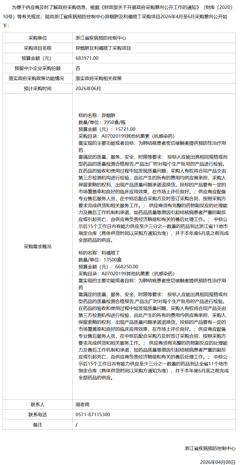 【浙江省疾病预防控制中心】浙江省疾病预防控制中心异烟肼及利福喷丁采购项目2026年4月至6月政府采购意向