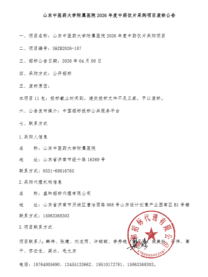 【山东中医药大学附属医院】山东中医药大学附属医院2026年度中药饮片采购项目-废标公告