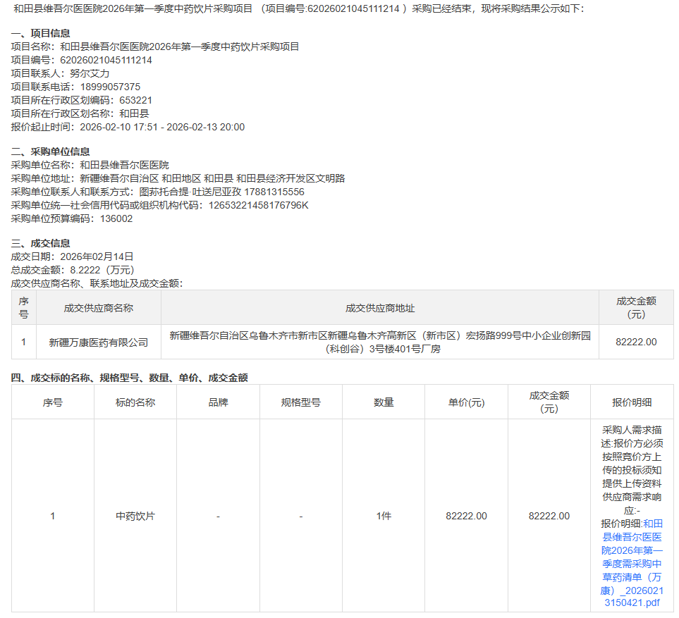 【和田地区和田县维吾尔医医院】新疆维吾尔自治区和田地区和田县维吾尔医医院和田县维吾尔医医院2026年第一季度中药饮片采购项目竞价成交公告