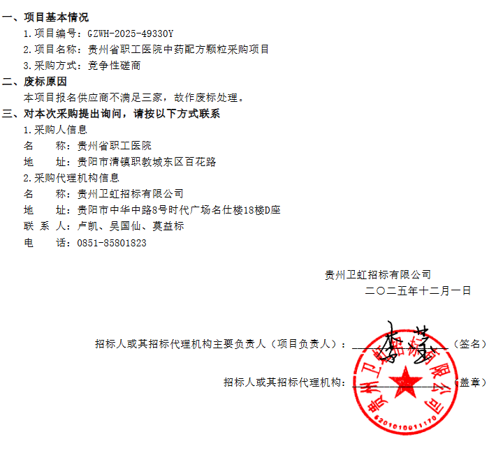 【贵州省职工医院】贵州省职工医院中药配方颗粒采购项目废标公告