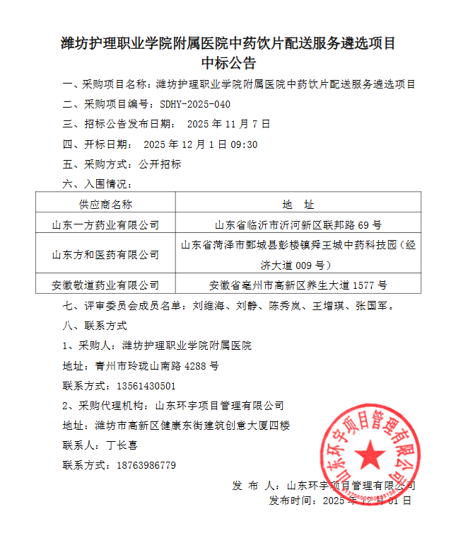 【潍坊护理职业学院附属医院】山东省潍坊护理职业学院附属医院中药饮片配送服务遴选项目中标公告