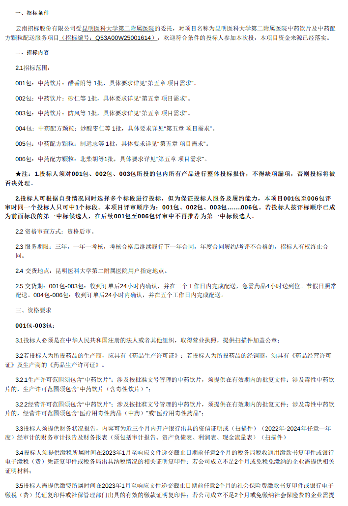 【昆明医科大学第二附属医院】云南省昆明医科大学第二附属医院中药饮片及中药配方颗粒配送服务项目招标公告