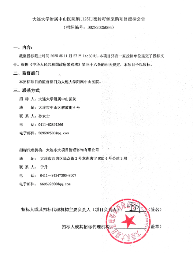 【大连大学附属中山医院】辽宁省大连大学附属中山医院碘〔125I〕密封籽源采购项目废标公告(20251127)