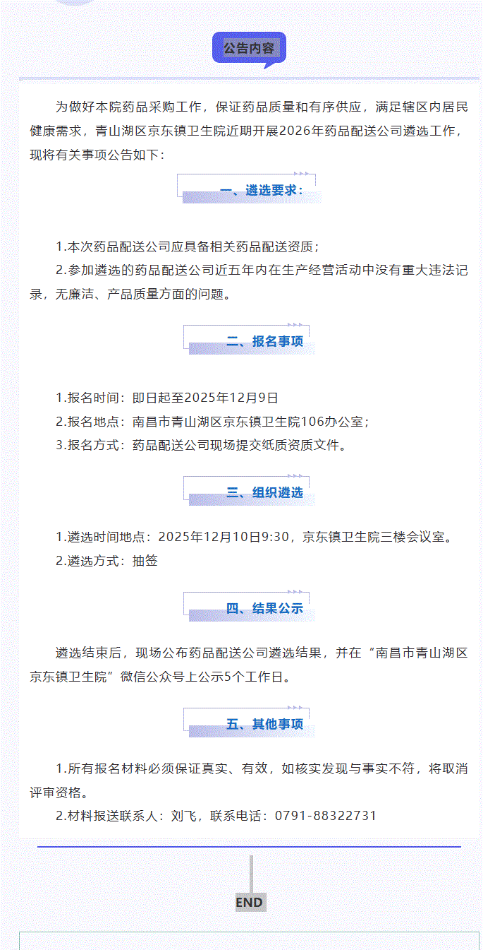 【南昌市青山湖区京东镇卫生院】江西省南昌市青山湖区京东镇卫生院2026年药品配送公司遴选公告
