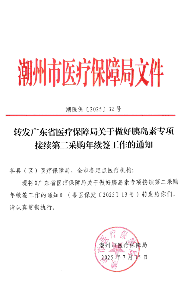 【潮州】转发广东省医疗保障局关于做好胰岛素专项接续第二采购年续签工作的通知
