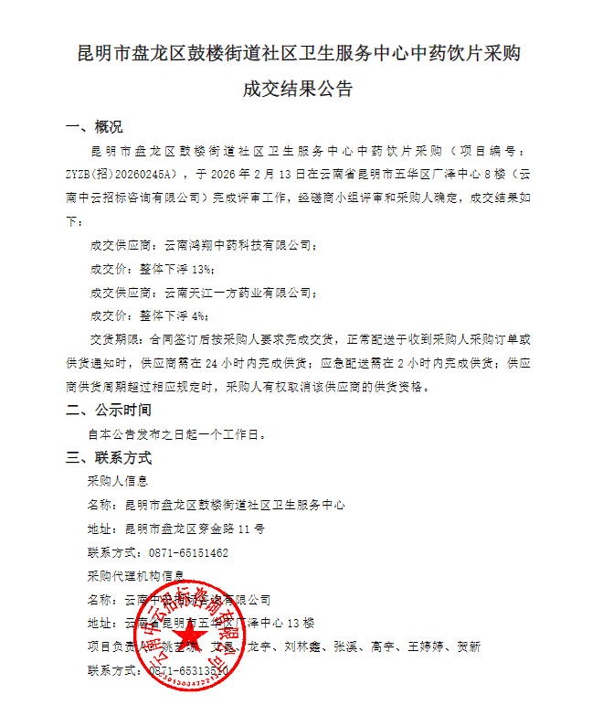 【昆明市盘龙区鼓楼街道社区卫生服务中心】云南省昆明市盘龙区鼓楼街道社区卫生服务中心中药饮片采购成交结果公告