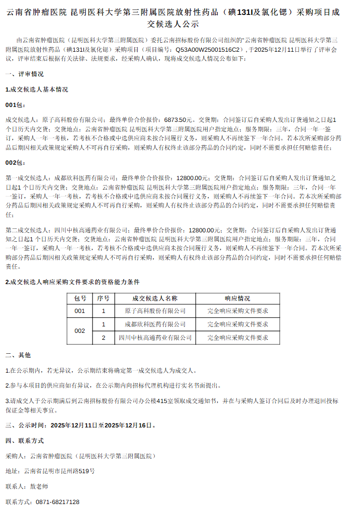 【云南省肿瘤医院】云南省肿瘤医院昆明医科大学第三附属医院放射性药品(碘131I及氯化锶)采购项目中标候选人公示