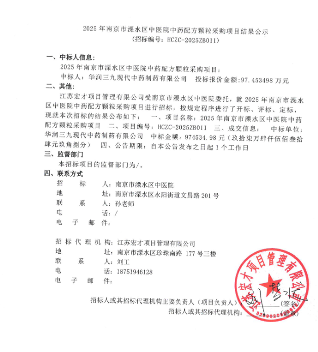 【南京市溧水区中医院】江苏省2025年南京市溧水区中医院中药配方颗粒采购项目结果公示