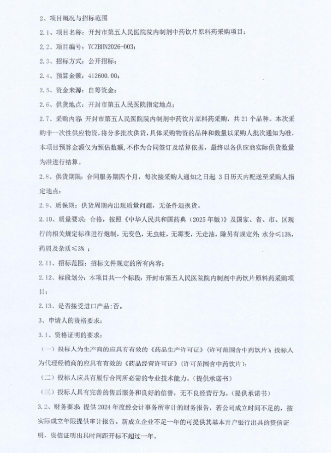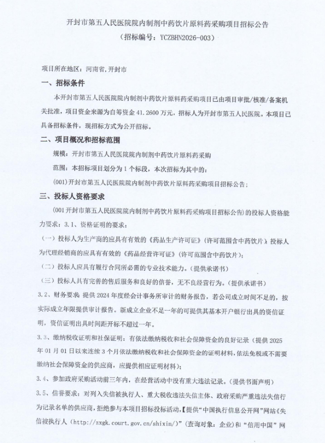 【开封市第五人民医院】河南省开封市第五人民医院院内制剂中药饮片原料药采购项目招标公告