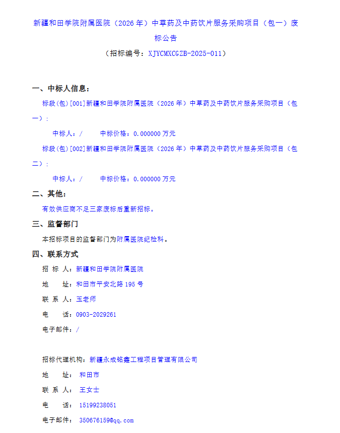 【新疆和田学院附属医院】新疆和田学院附属医院(2026年)中草药及中药饮片服务采购项目(包一)废标公告