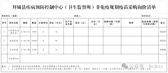 项目清单:拜城县疾病预防控制中心(卫生监督所)非免疫规划疫苗采购询价清单。