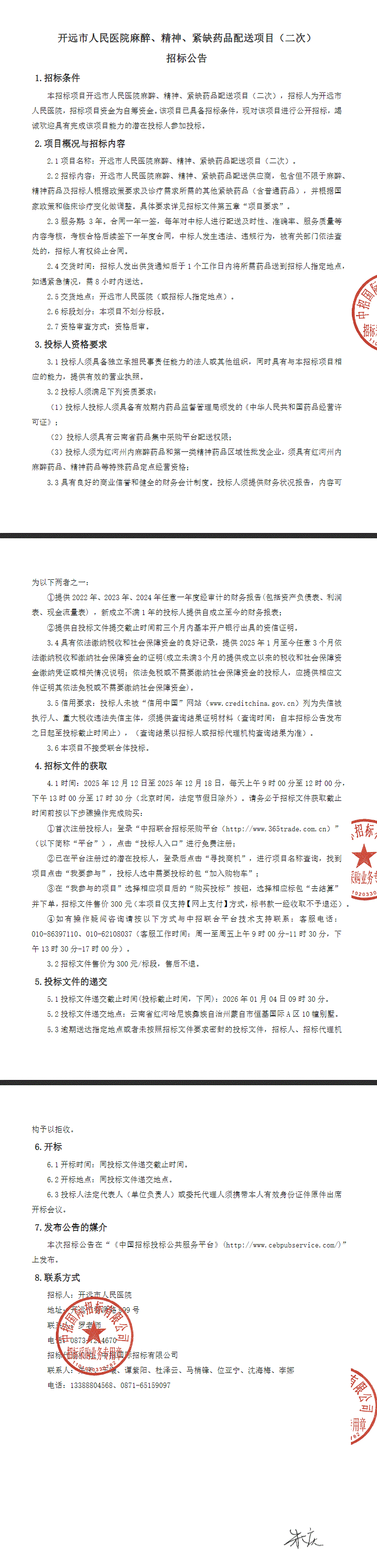 【红河哈尼族彝族自治州开远市人民医院】云南省开远市人民医院麻醉、精神、紧缺药品配送项目(二次) 招标公告