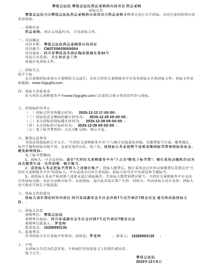 【攀枝花市攀煤总医院】四川省攀煤总医院药品采购供应商项目