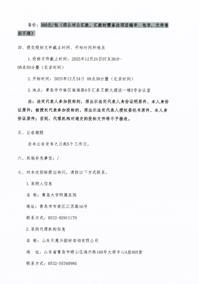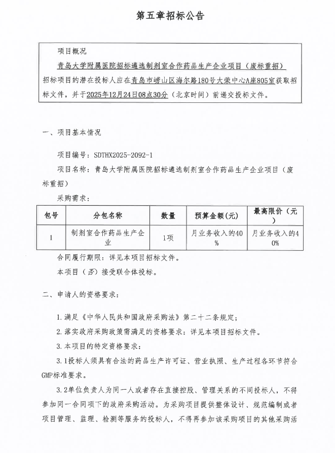 【青岛大学附属医院】山东省青岛大学附属医院招标遴选制剂室合作药品生产企业项目(废标重招)公开招标