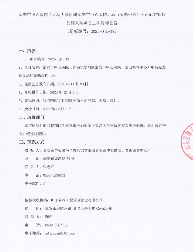 【泰安市中心医院】山东省泰安市中心医院(青岛大学附属泰安市中心医院、泰山医养中心)中药配方颗粒品种采购项目二次废标公告