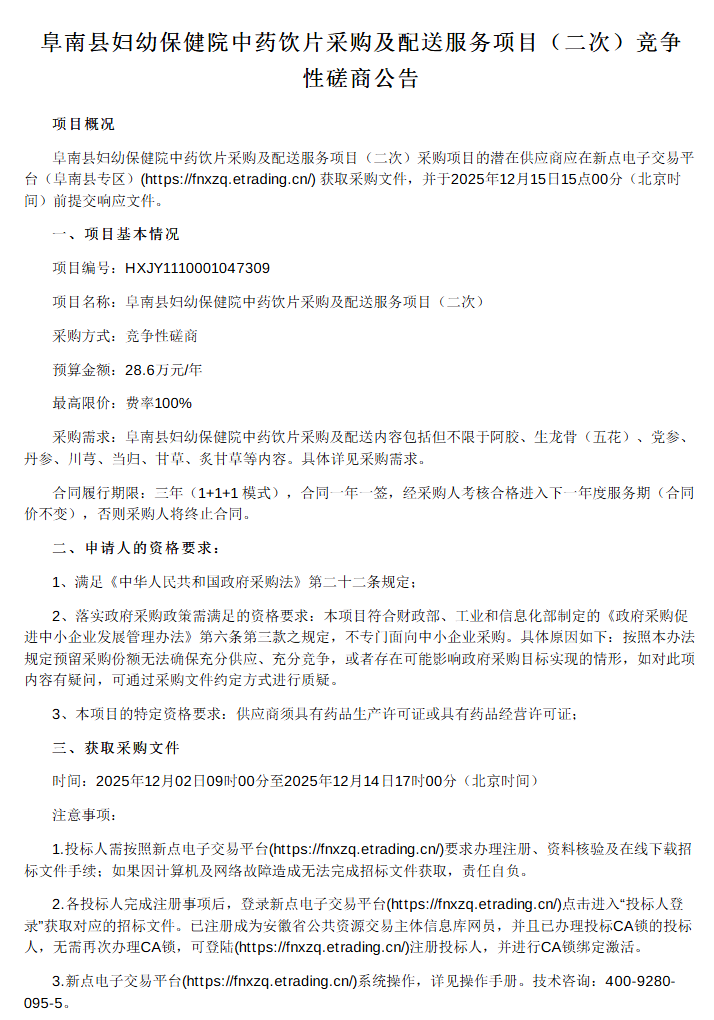 【阜阳市阜南县妇幼保健院】安徽省阜阳市阜南县妇幼保健院中药饮片采购及配送服务项目(二次)