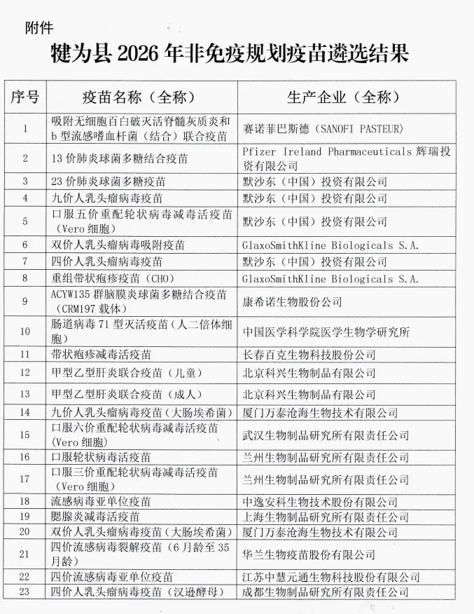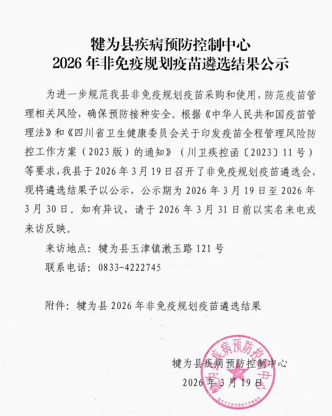 【乐山】犍为县疾病预防控制中心2026年非免疫规划疫苗遴选结果公示