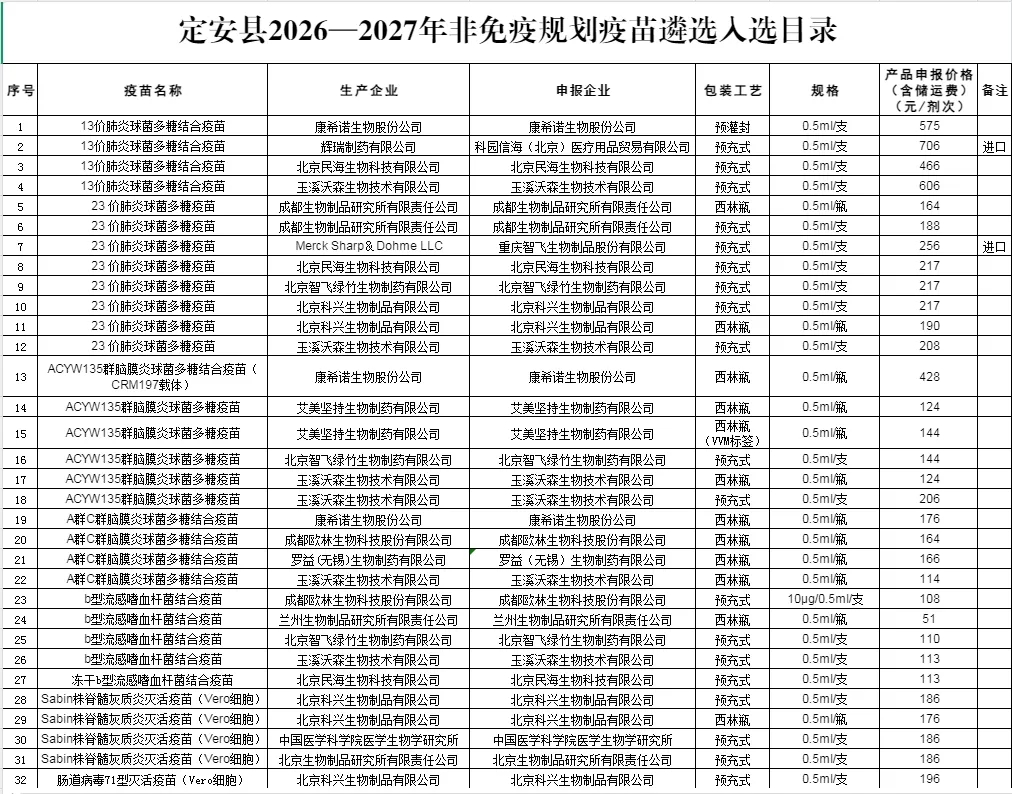 经过公平、公正、公开的评审程序,确定以下疫苗为定安县2026年—2027年非免疫规划疫苗遴选入选品种(具体目录详见附件《定安县2026年—2027年非免疫规划疫苗遴选入选目录》)。
