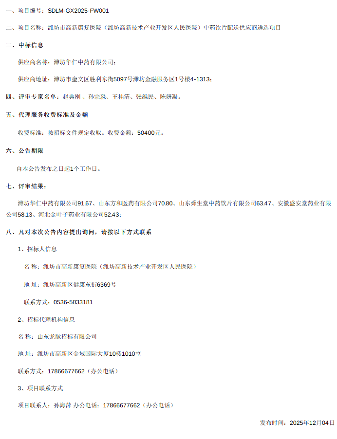【潍坊市高新康复医院】山东省潍坊市高新康复医院(潍坊高新技术产业开发区人民医院)中药饮片配送供应商遴选项目中标公告