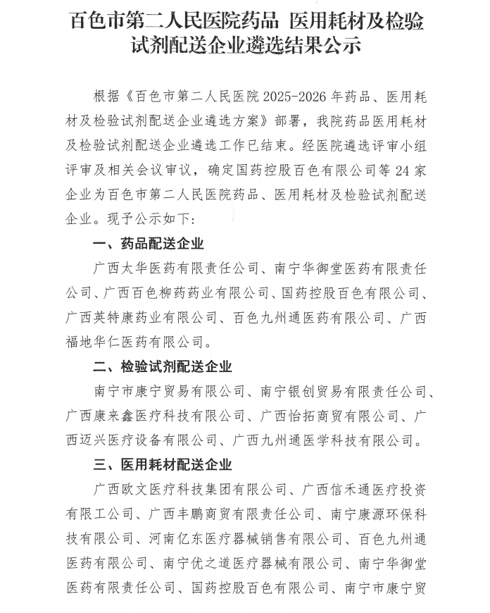 广西壮族自治区百色市第二人民医院药品医用耗材及检验试剂配送企业遴选结果公示