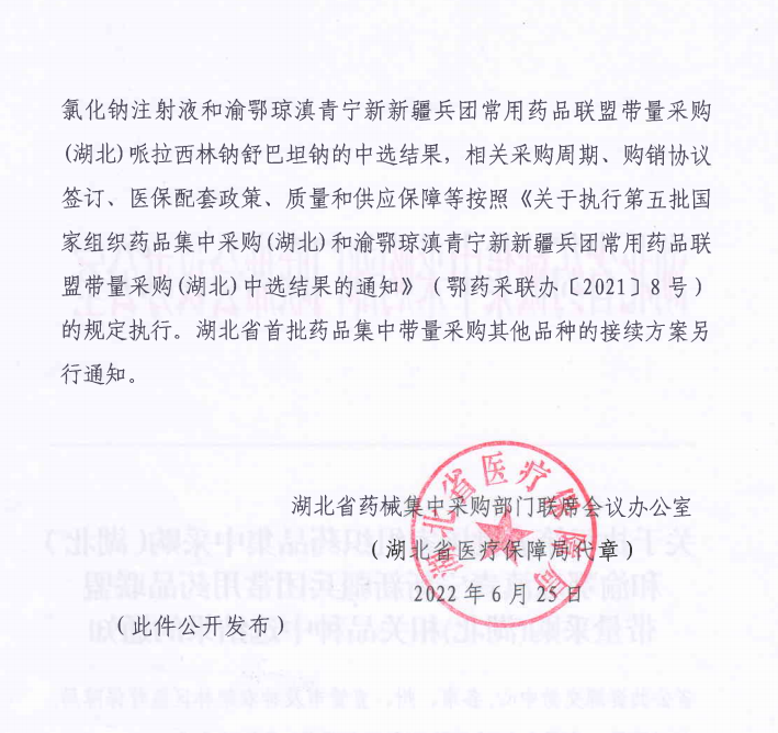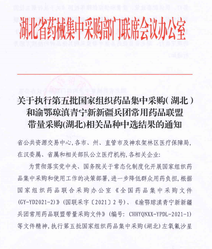【湖北】湖北省关于执行第五批国家组织药品集中采购(湖北)和渝鄂琼滇青宁新新疆兵团常用药品联盟带量采购(湖北)相关品种中选结果的通知