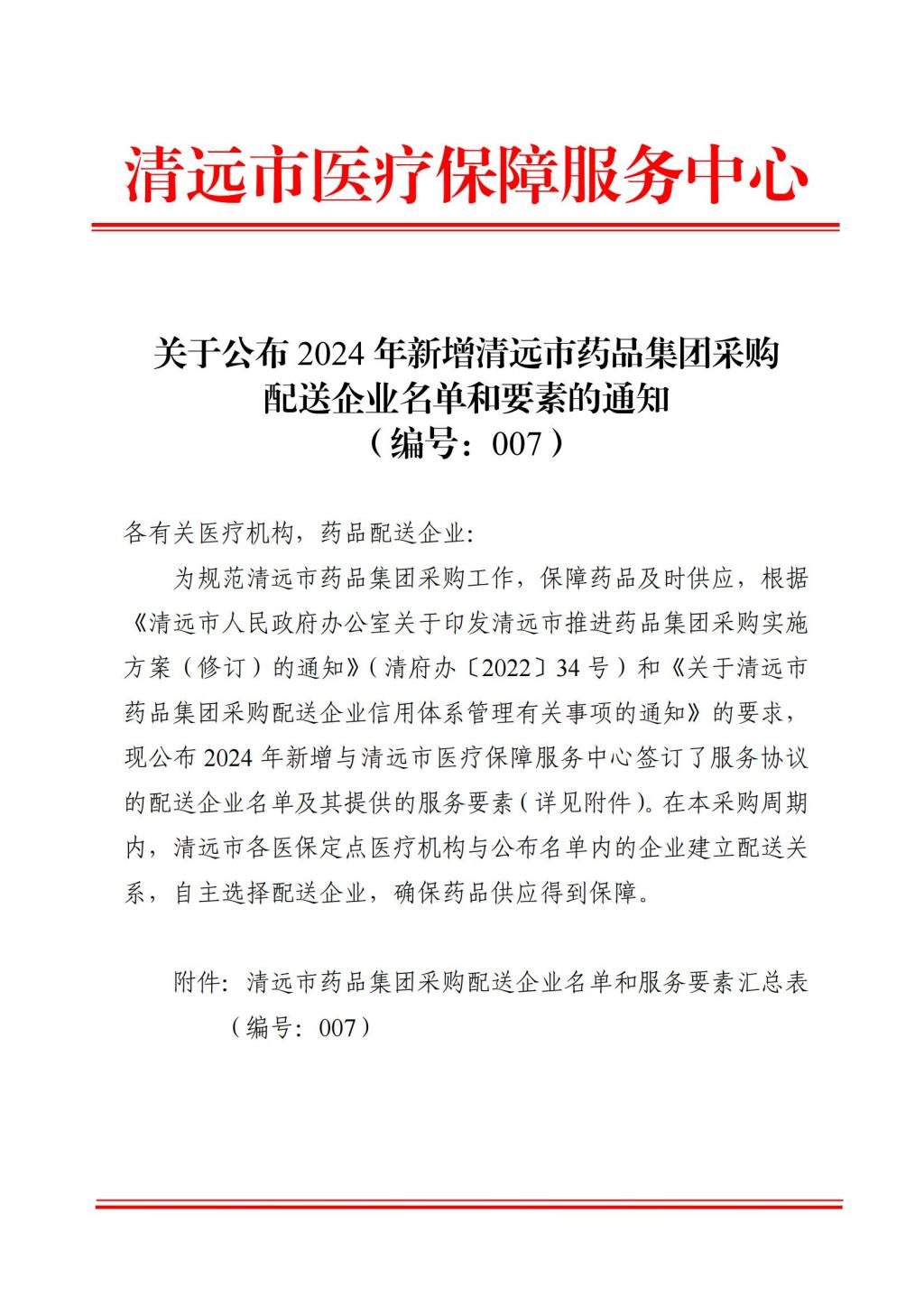为规范清远市药品集团采购工作,保障药品及时供应,根据《清远市人民政府办公室关于印发清远市推进药品集团采购实施方案(修订)的通知》(清府办〔2022〕34号)和《关于清远市药品集团采购配送企业信用体系管理有关事项的通知》的要求,现公布2024年新增与清远市医疗保障服务中心签订了服务协议的配送企业名单及其提供的服务要素(详见附件)。在本采购周期内,清远市各医保定点医疗机构与公布名单内的企业建立配送关系,自主选择配送企业,确保药品供应得到保障。