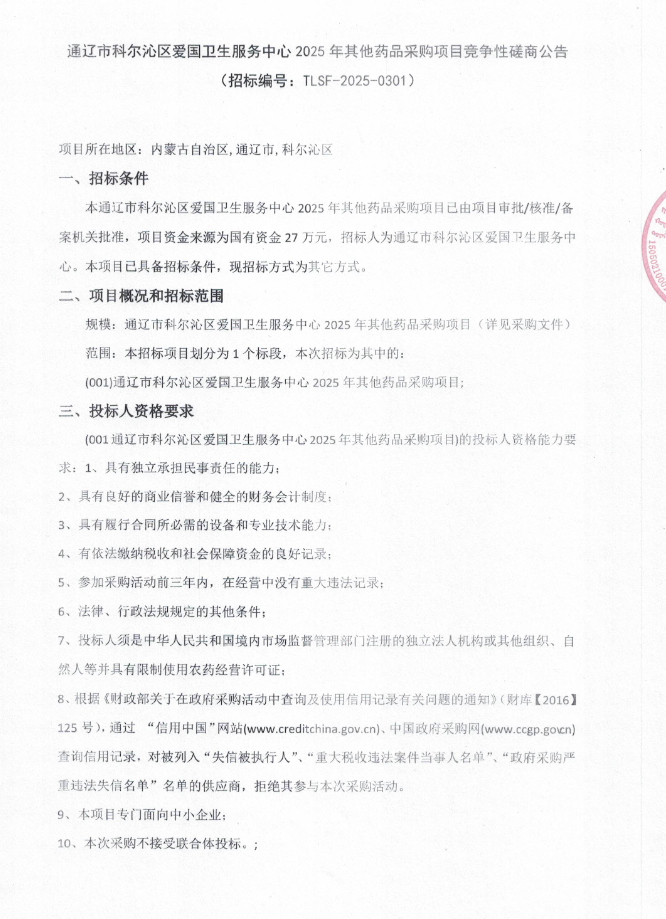 【通辽市科尔沁区爱国卫生服务中心】内蒙古自治区通辽市科尔沁区爱国卫生服务中心2025年其他药品采购项目竞争性磋商公告