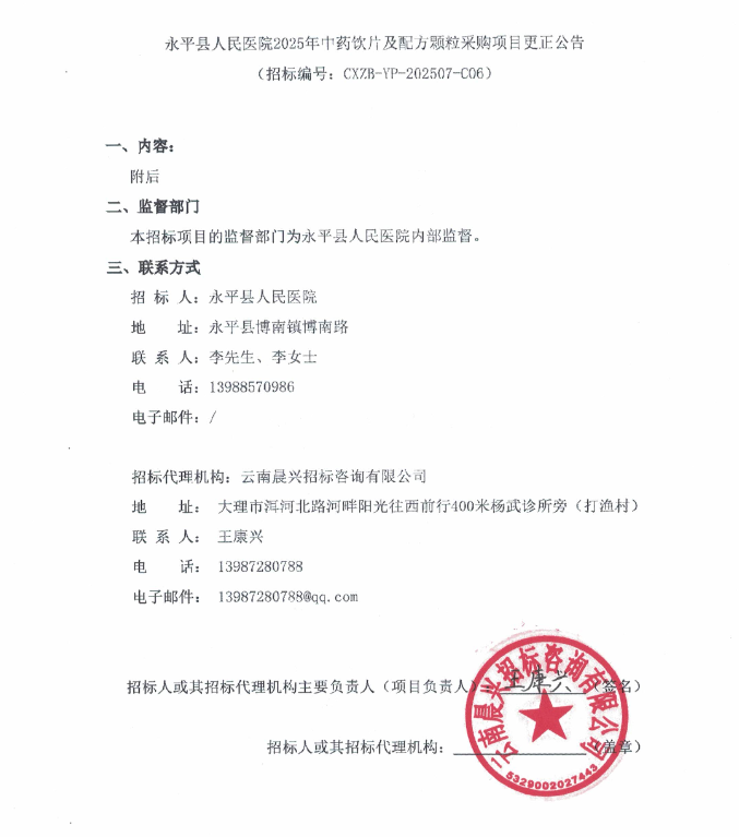 【大理白族自治州永平县人民医院】云南省大理白族自治州永平县人民医院2025年中药饮片及配方颗粒采购项目更正公告