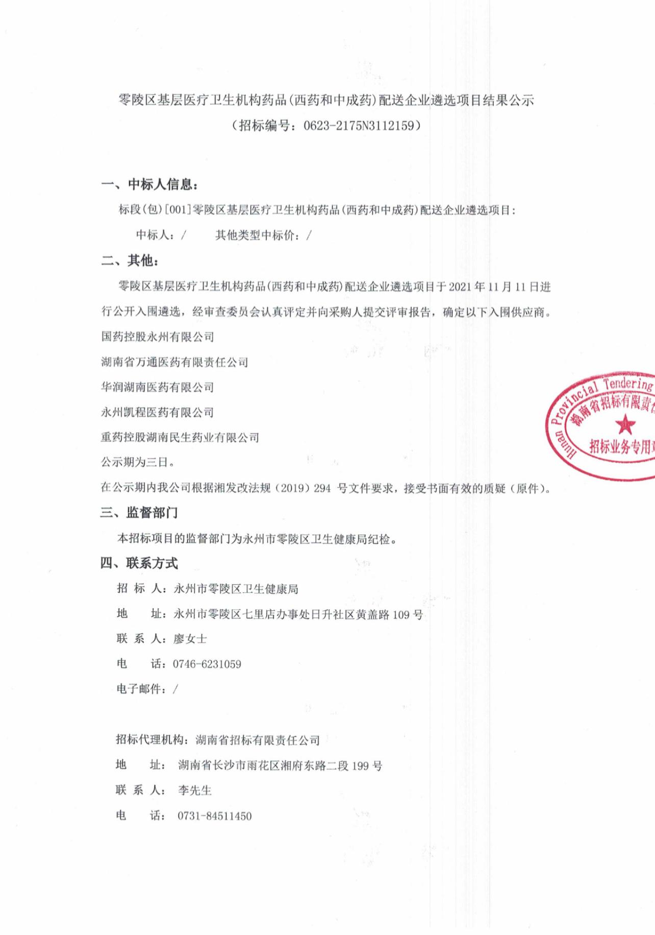 【永州】湖南省永州市零陵区基层医疗卫生机构药品(西药和中成药)配送企业遴选项目结果公示