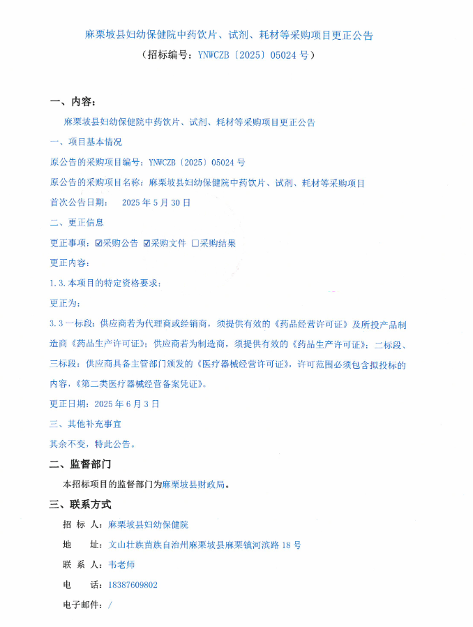 【文山壮族苗族自治州麻栗坡县妇幼保健院】云南省文山壮族苗族自治州麻栗坡县妇幼保健院中药饮片、试剂、耗材等采购项目更正公告