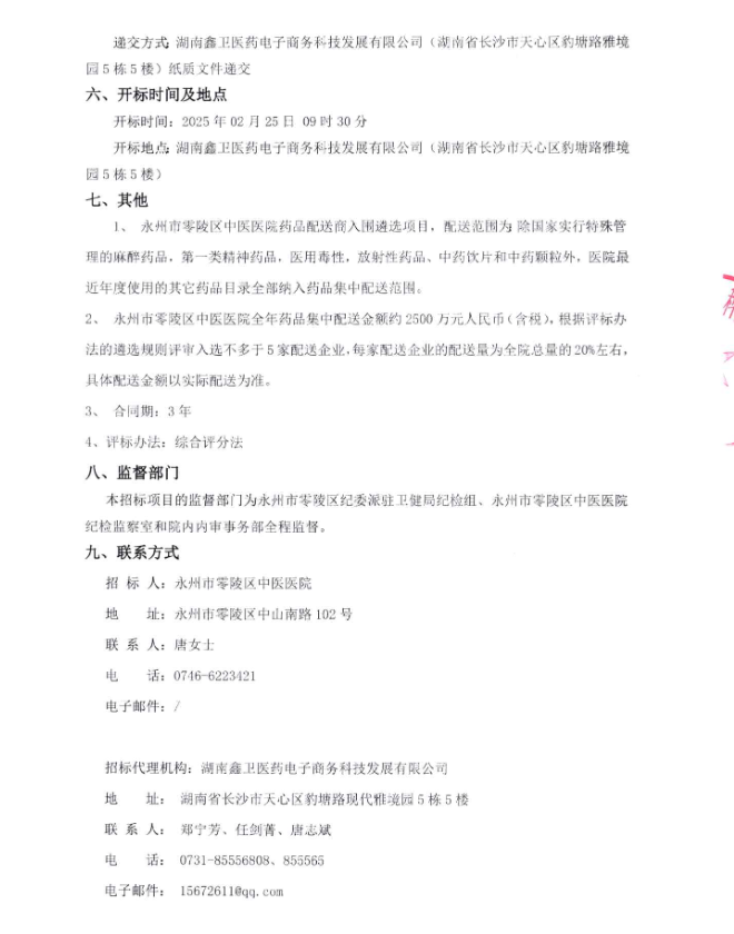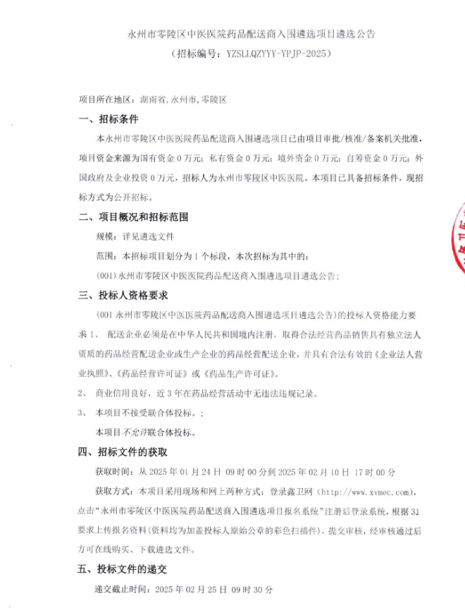 【永州市零陵区中医医院】湖南省永州市零陵区中医医院药品配送商入围遴选项目遴选公告