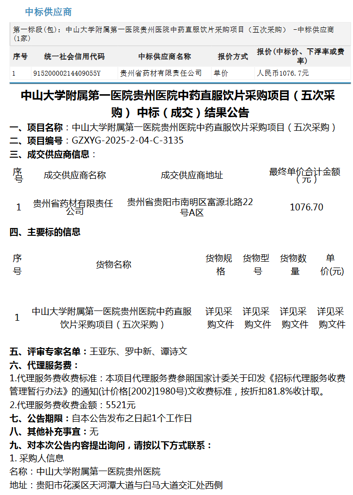 【中山大学附属第一医院贵州医院】中山大学附属第一医院贵州医院中药直服饮片采购项目(五次采购)中标结果公示