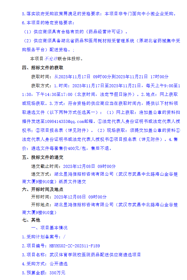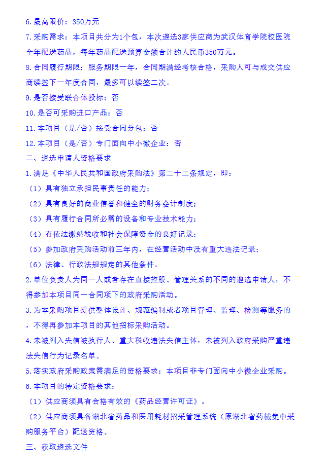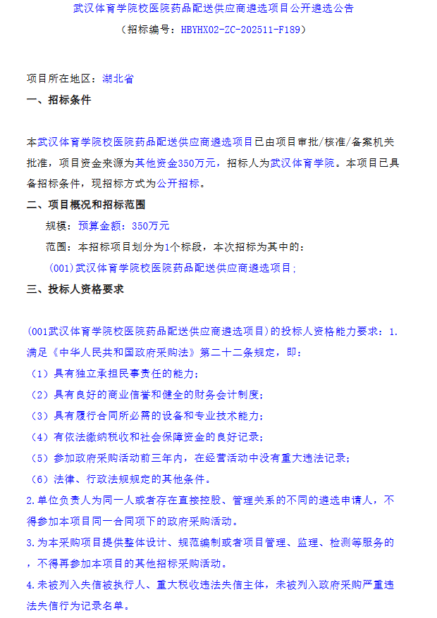 【武汉体育学院校】湖北省武汉体育学院校医院药品配送供应商遴选项目公开遴选公告