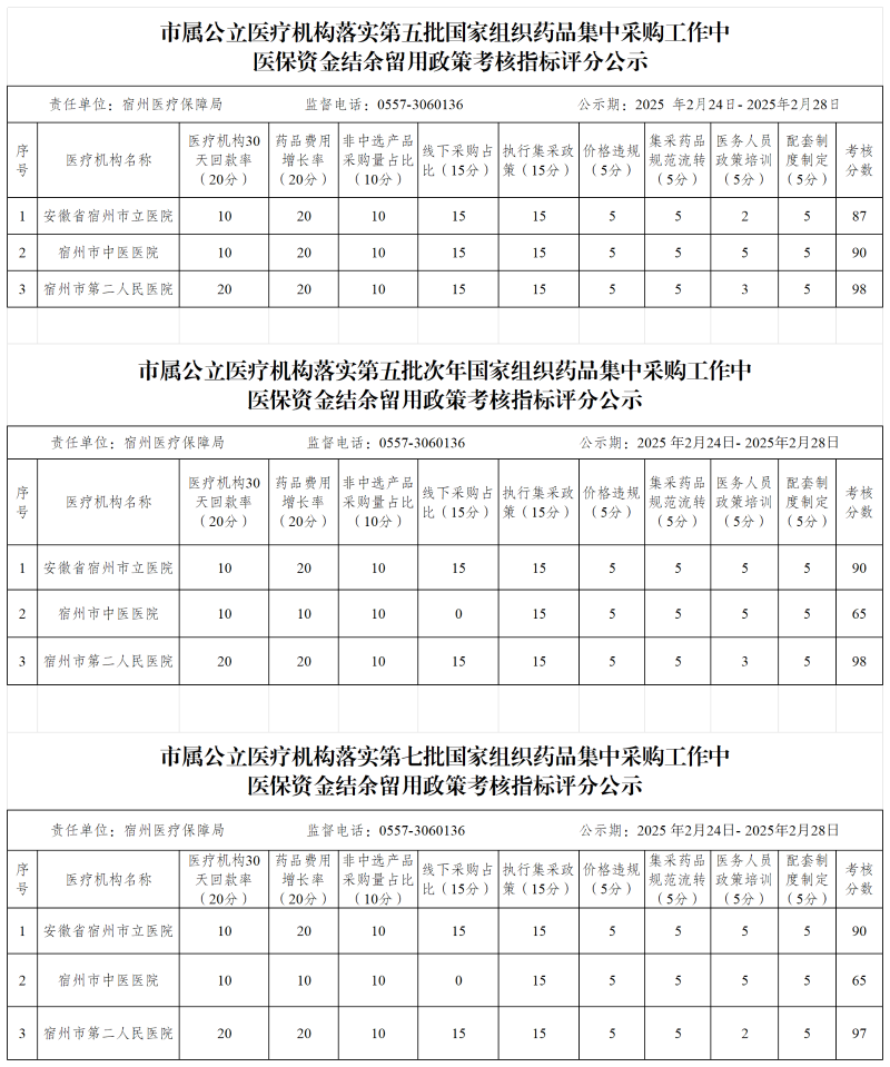 【宿州】市属定点医疗机构落实第五批、第五批次年及第七批国家组织药品集中采购结余留用政策考核指标评分公示