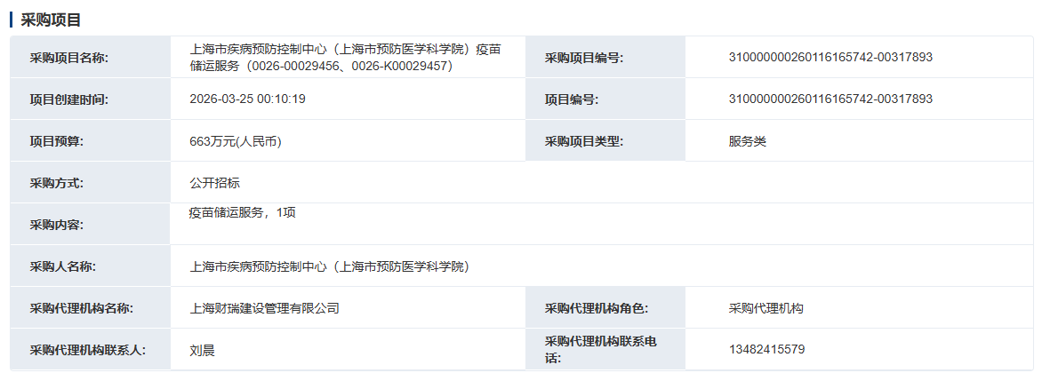 【上海市疾病预防控制中心】上海市疾病预防控制中心(上海市预防医学科学院)疫苗储运服务(0026-00029456、0026-K00029457)