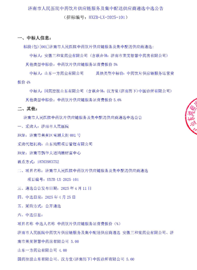 【济南市人民医院】山东省济南市人民医院中药饮片供应链服务及集中配送供应商遴选中选公告