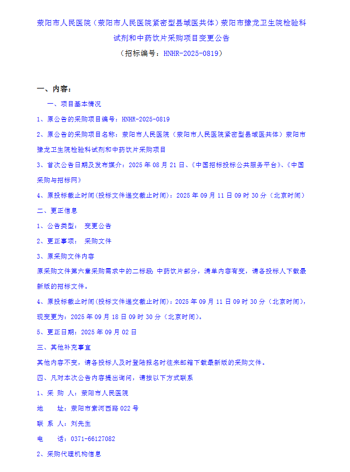【荥阳市人民医院】河南省荥阳市人民医院(荥阳市人民医院紧密型县域医共体)荥阳市豫龙卫生院检验科试剂和中药饮片采购项目变更公告