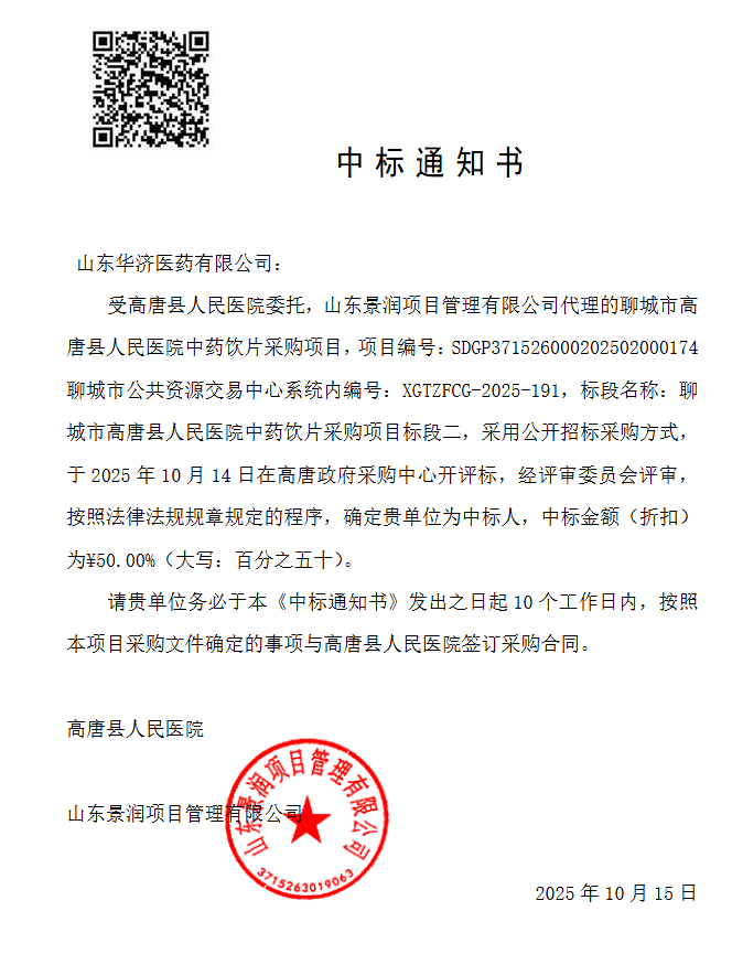 【聊城市高唐县人民医院】山东省聊城市高唐县人民医院中药饮片采购项目标段二中标通知书