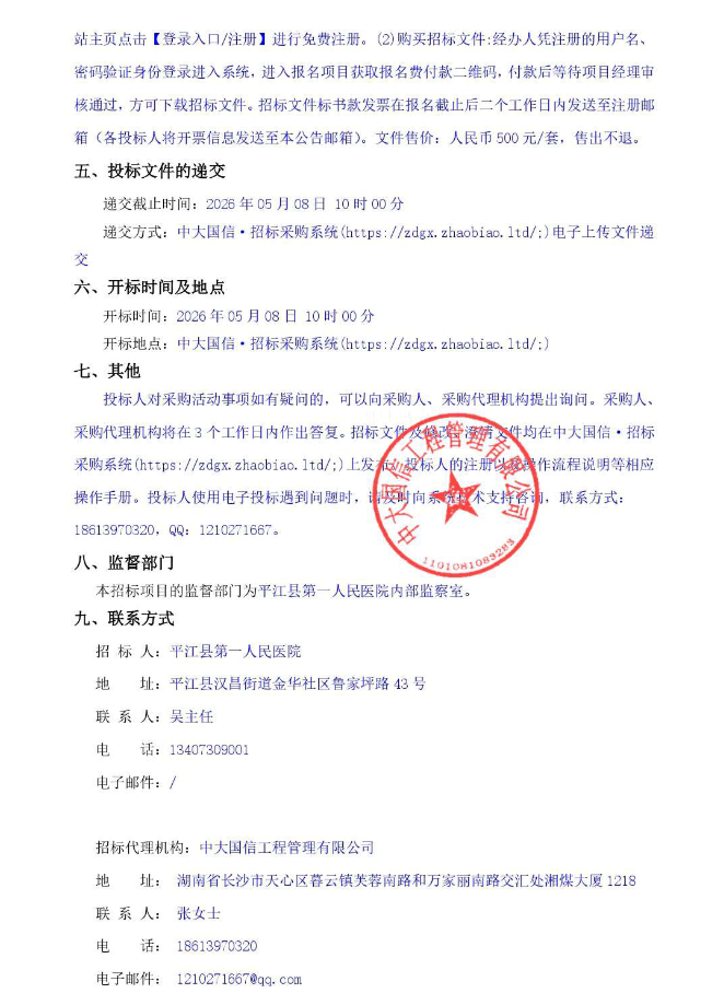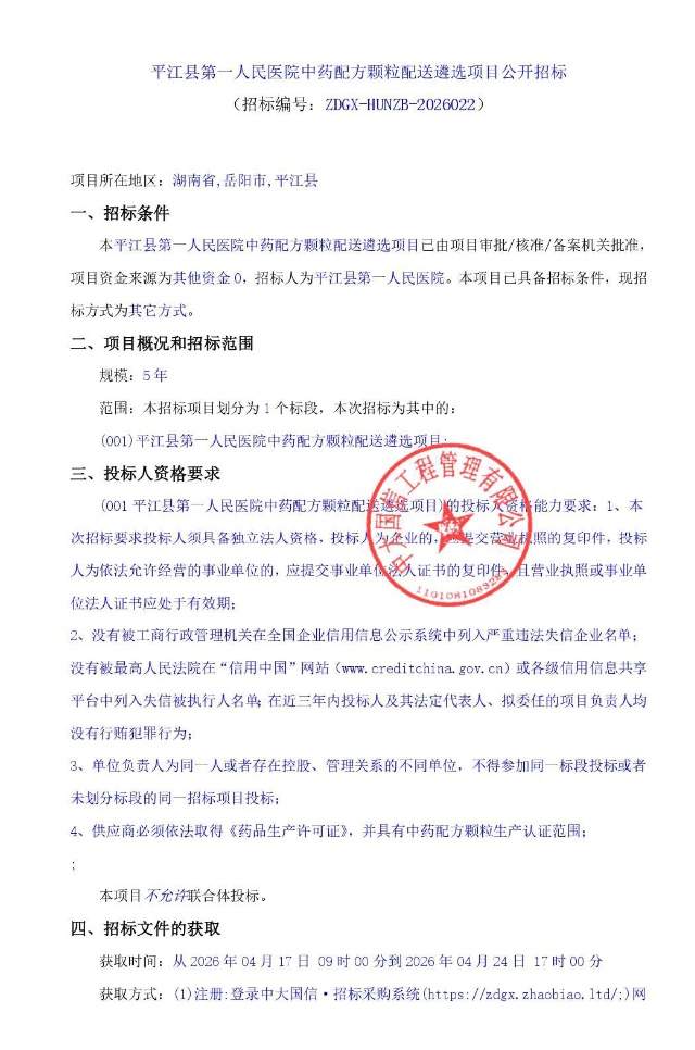 【岳阳市平江县第一人民医院】湖南省岳阳市平江县第一人民医院中药配方颗粒配送遴选项目公开招标