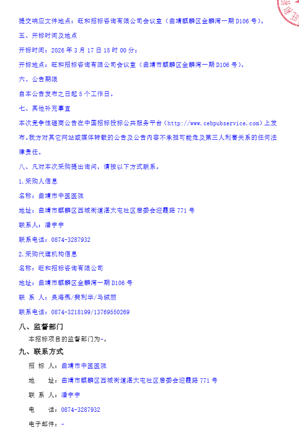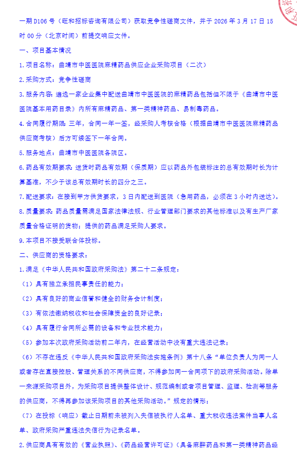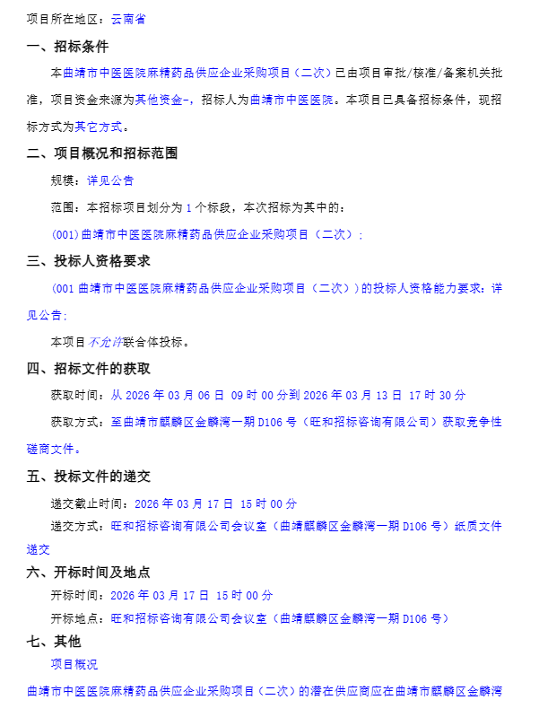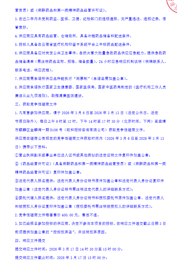 【曲靖市中医医院】云南省曲靖市中医医院麻精药品供应企业采购项目(二次)竞争性磋商公告