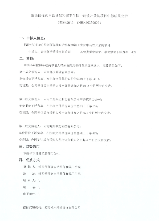 【迪庆藏族自治州维西傈僳族自治县保和镇卫生院】云南省维西傈僳族自治县保和镇卫生院中药饮片采购项目中标结果公示