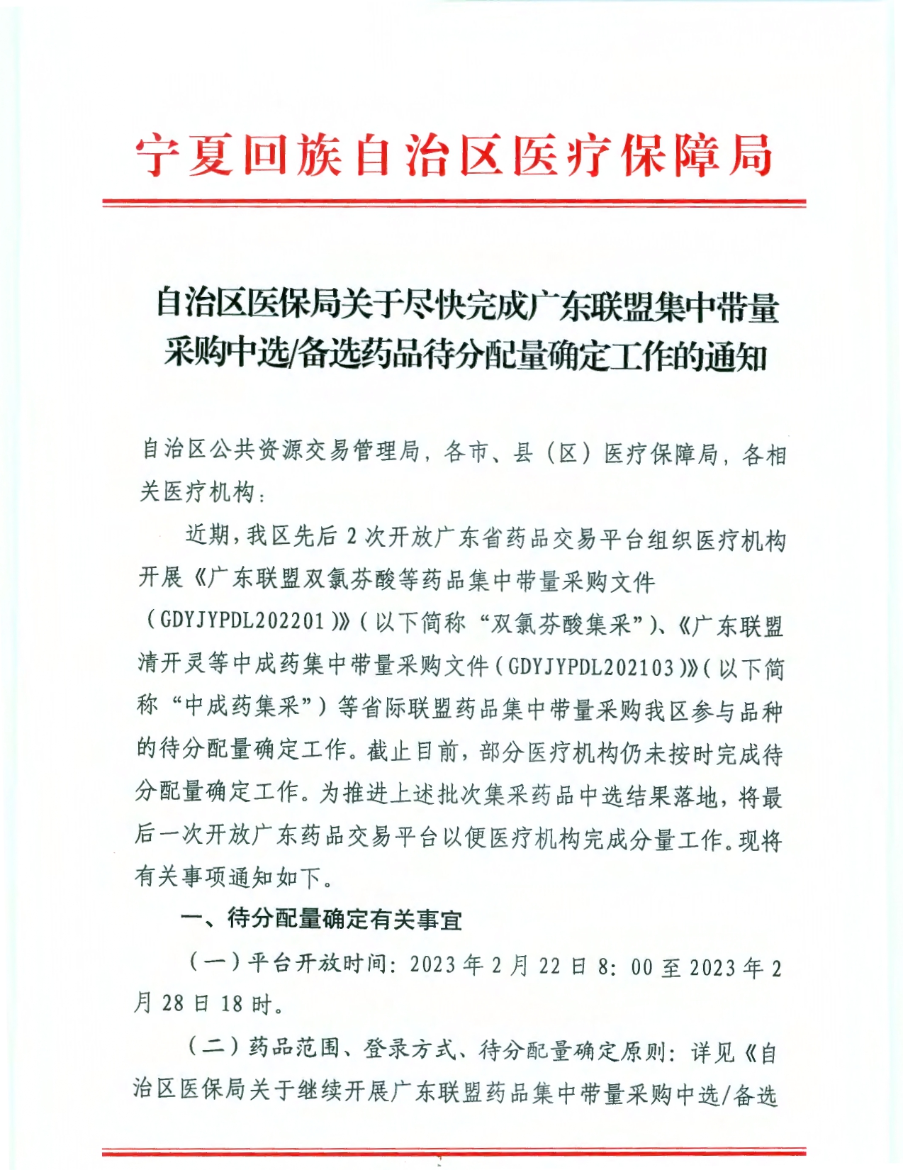 (GDYJYPDL202201)》(以下简称“双氯芬酸集采”)、《广东联盟清开灵等中成药集中带量采购文件(GDYJYPDL202103)》(以下简称“中成药集采”)等省际联盟药品集中带量采购我区参与品种的待分配量确定工作。截止目前,部分医疗机构仍未按时完成待分配量确定工作。为推进上述批次集采药品中选结果落地,将最后一次开放广东药品交易平台以便医疗机构完成分量工作。现将有关事项通知如下。