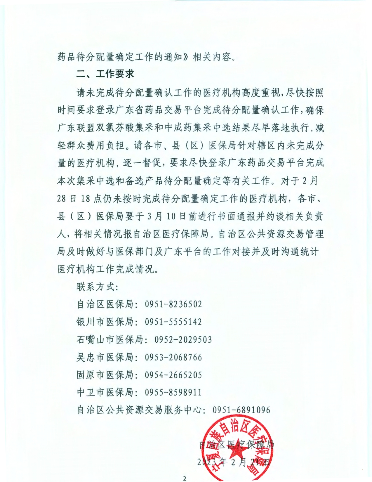 请未完成待分配量确认工作的医疗机构高度重视,尽快按照时间要求登录广东省药品交易平台完成待分配量确认工作,确保广东联盟双氯芬酸集采和中成药集采中选结果尽早落地执行,减轻群众费用负担。请各市、县(区)医保局针对辖区内未完成分量的医疗机构,逐一督促,要求尽快登录广东药品交易平台完成本次集采中选和备选产品待分配量确定等有关工作。对于2月28日18点仍未按时完成待分配量确定工作的医疗机构,各市、县(区)医保局要于3月10日前进行书面通报并约谈相关负责人,将相关情况报自治区医疗保障局。自治区公共资源交易管理局及时做好与医保部门及广东平台的工作对接并及时沟通统计医疗机构工作完成情况。