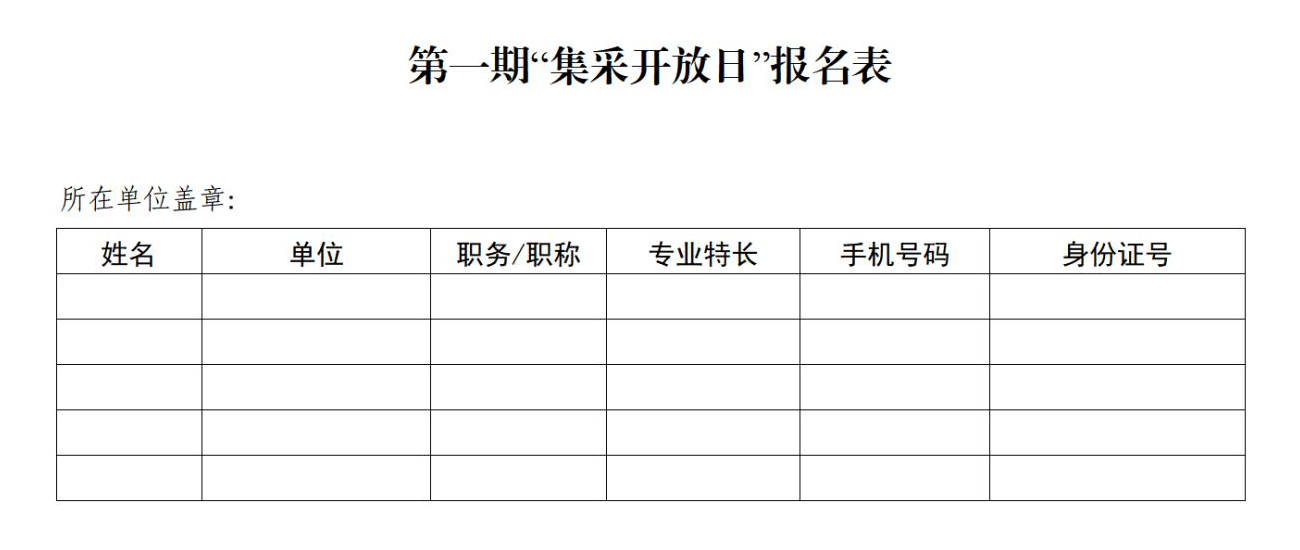 以个人自荐方式报名,于2月24日(星期一)17:00前将报名表扫描件(有单位的加盖单位公章)发送至邮箱gjybjxwb@nhsa.gov.cn(邮件标题为:集采开放日报名)。报名表见下方附件。