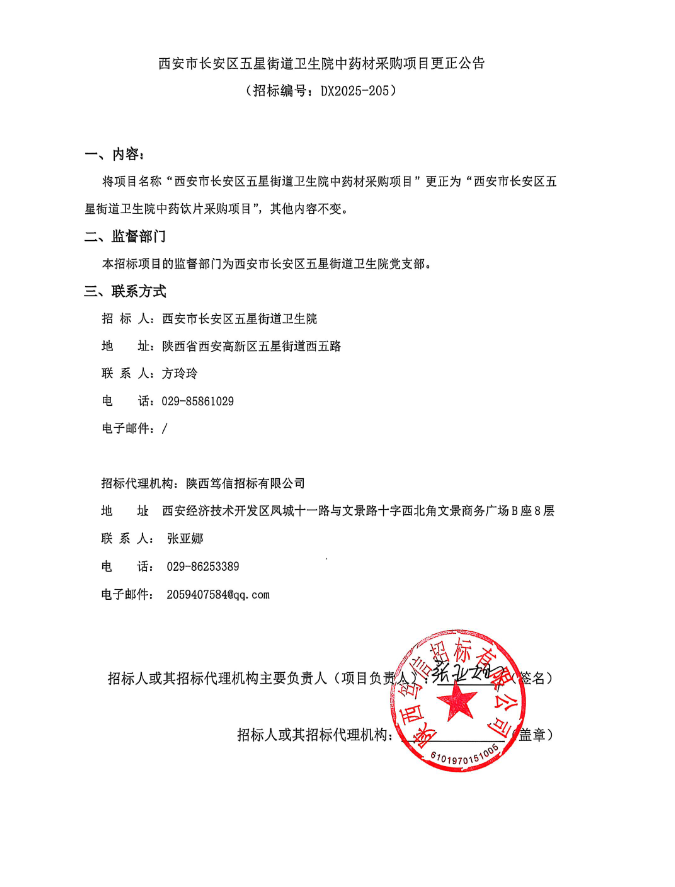【西安市长安区五星街道卫生院】陕西省西安市长安区五星街道卫生院中药材采购项目更正公告