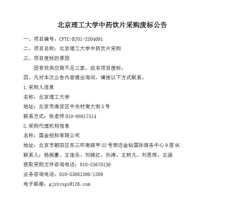 【北京理工大学】北京理工大学中药饮片采购(2024-30802-ZC0642)废标公告