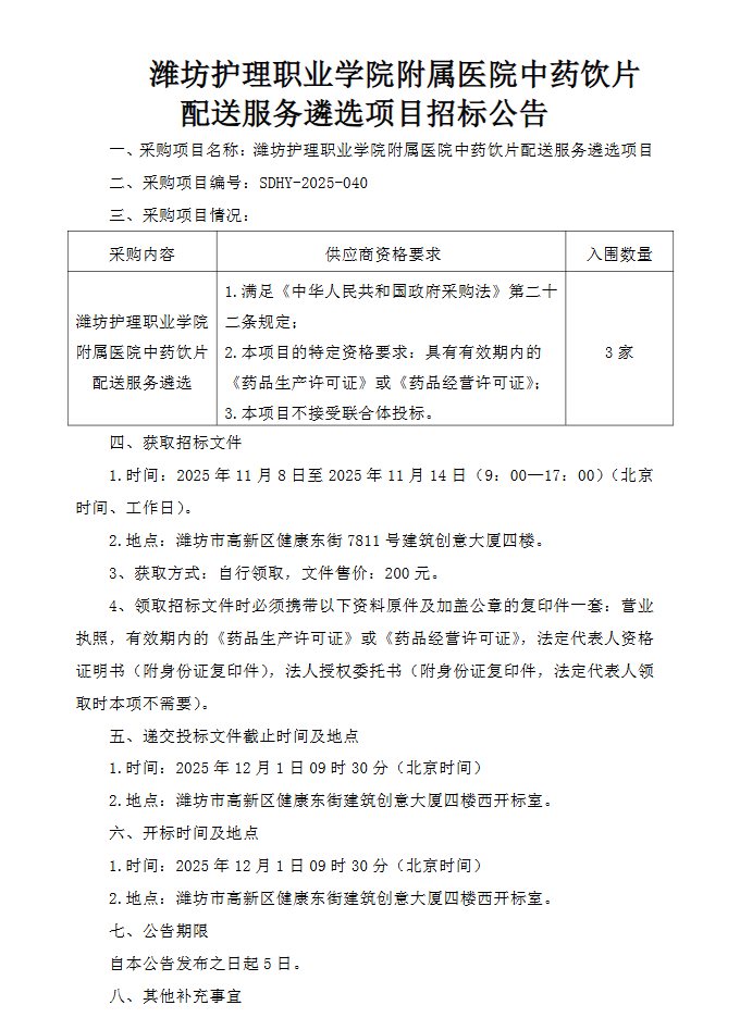 【潍坊护理职业学院附属医院】山东省潍坊护理职业学院附属医院中药饮片配送服务遴选项目招标公告