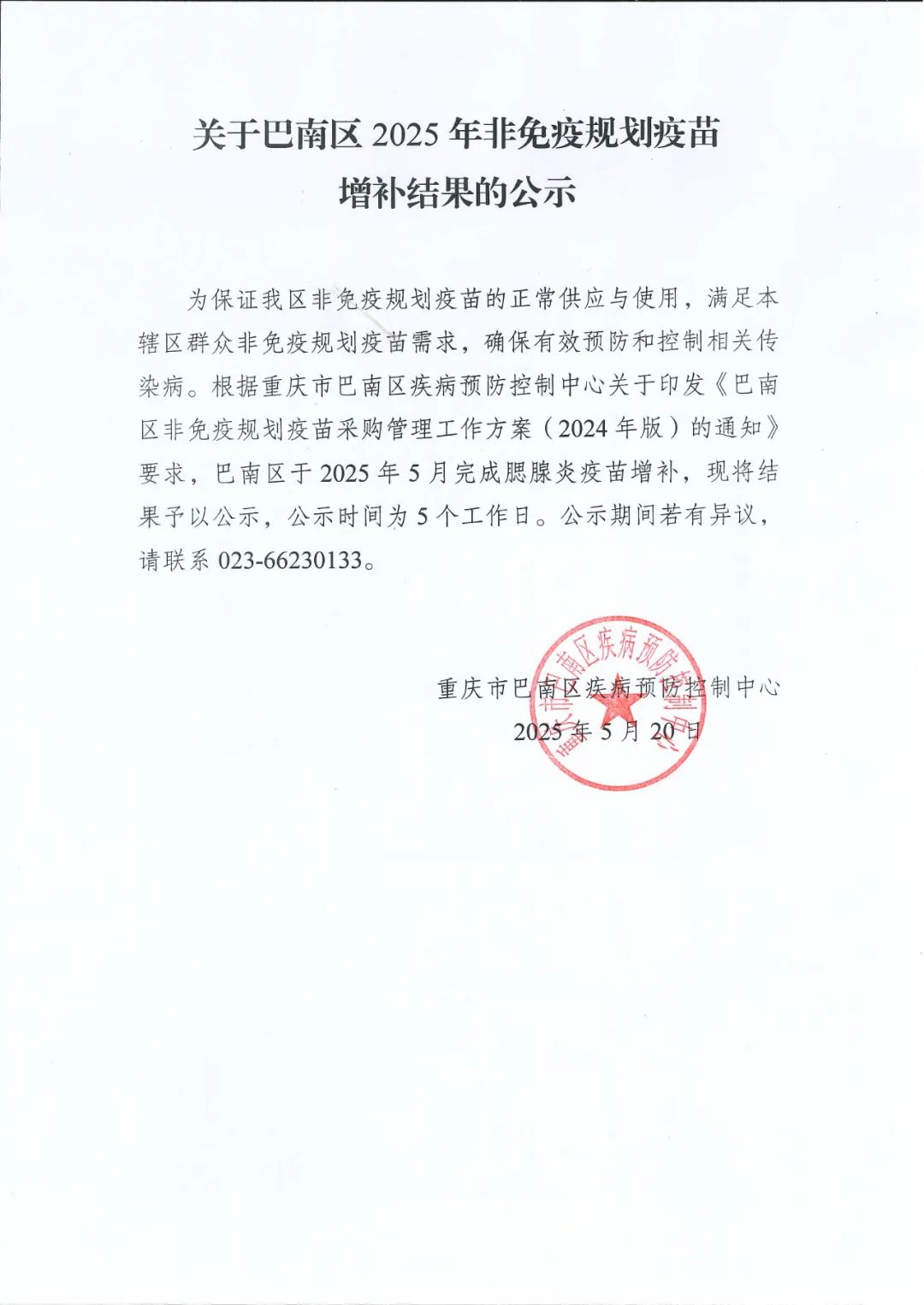 【重庆】巴南区2025年非免疫规划疫苗增补结果公示
